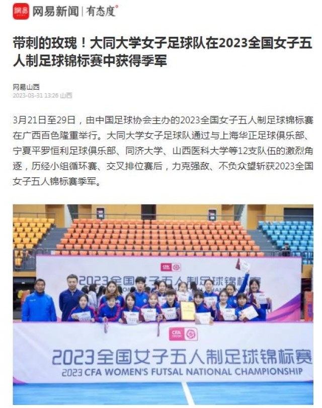 3月21日至29日,由中国足球协会主办的2023全国女子五人制足球锦标赛在广西百色隆重举行。大同大学女子足球队通过与上海华正足球俱乐部、宁夏平罗恒利足球俱乐部、同济大学、山西医科大学等12支队伍的激烈角逐,历经小组循环赛、交叉排位赛后,力克强敌、不负众望斩获2023全国女子五人锦标赛季军。
